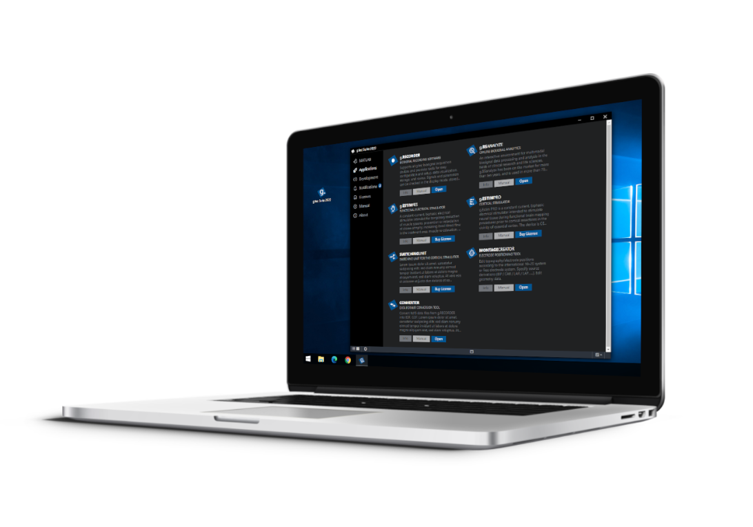 The g.tec Suite 2020 contains all software packages from g.tec, such as g.NEEDaccess with all APIs, g.HIsys, g.Recorder and g.BSanalyze. It allows an easy installation, update and organization of all software packages, and comes with an automatic software compatibility check to minimize any software issues on your computer.