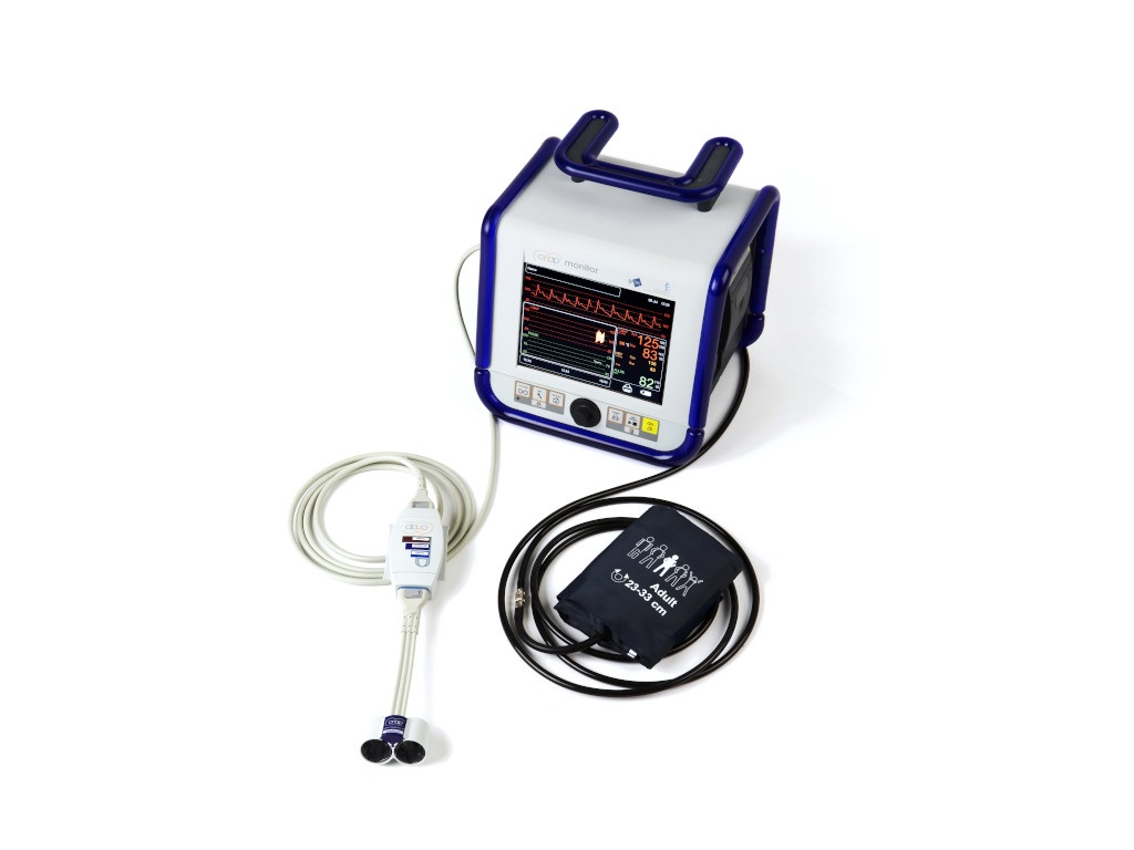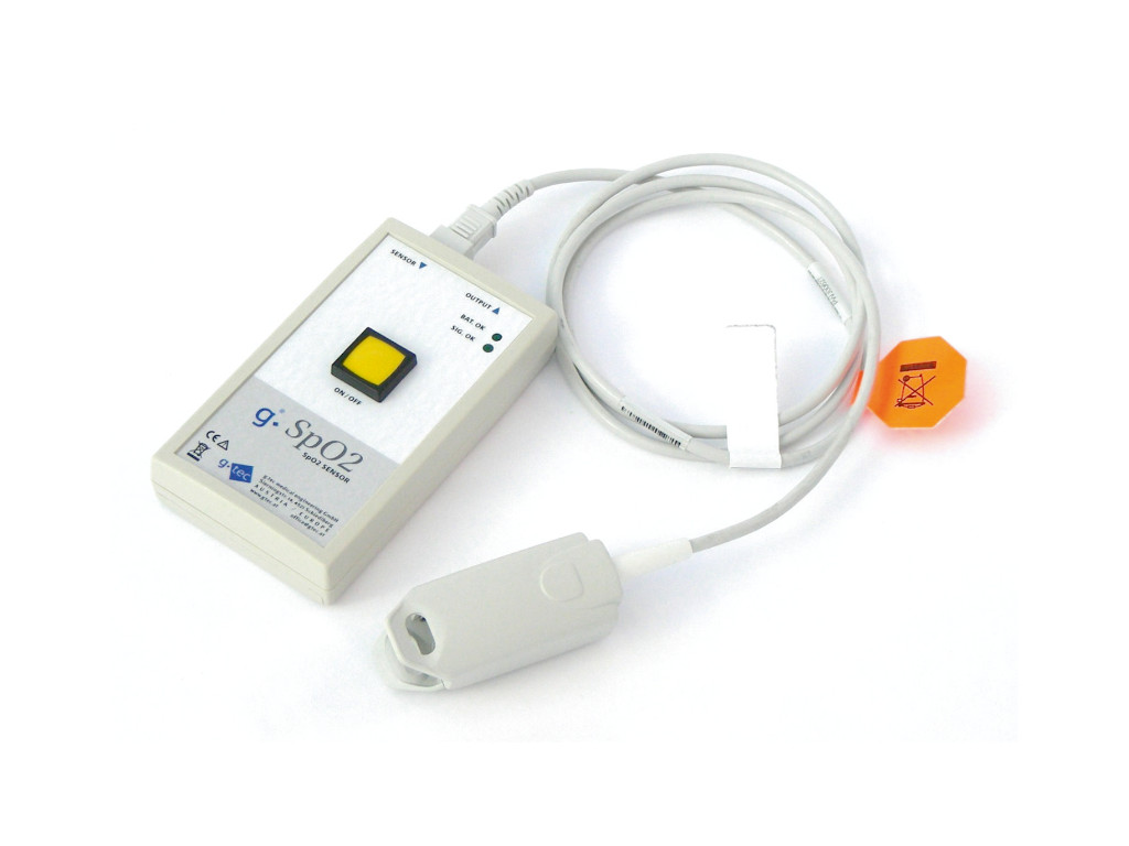 Two light sources with different wave lengths are used to measure the saturation of oxygen in the blood (SpO2) and the pulse. A sensor for the index finger or ear-lobe is available. A calibrated output signal is provided.