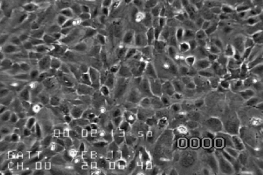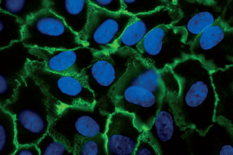 HUVEC, cultivated over 7 days at 10 dyn / cm². VE-cadherins are stained in green, cell nuclei are stained in blue.
