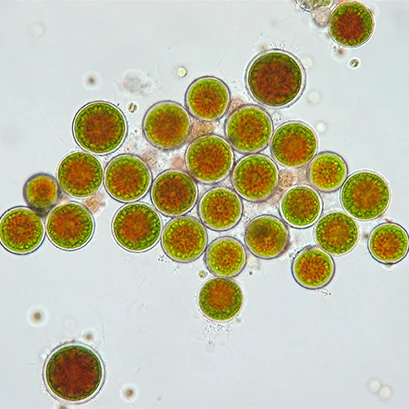 Brightfield microscopy of the green freshwater algae Haematococcus pluvialis in a µ-Slide 8 Well. The cells are in an immature cyst state with developing centers, filled with the strong antioxidant astaxanthin (red), and surrounded by Chlorophyll from the chloroplasts (green). 40x objective lens.