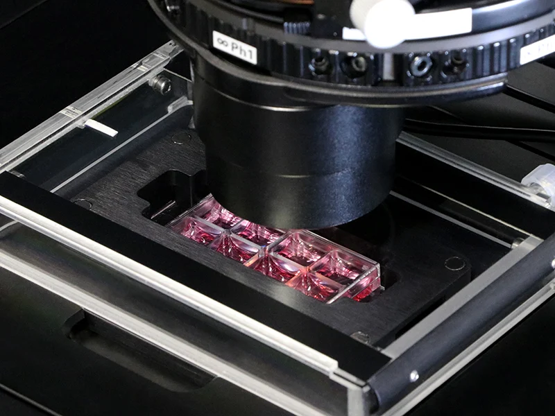 Live cell imaging in a µ-Slide 8 Well using transmitted light.