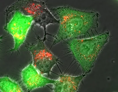 Live cell imaging on an inverted widefield fluorescence microscope. Rat fibroblast cells 24 hours after transfection with pCMV-eGFP. Red: Rhodamine-labelled fluorescent lipoplexes, Green: eGFP fluorescence. 60x objective lens.