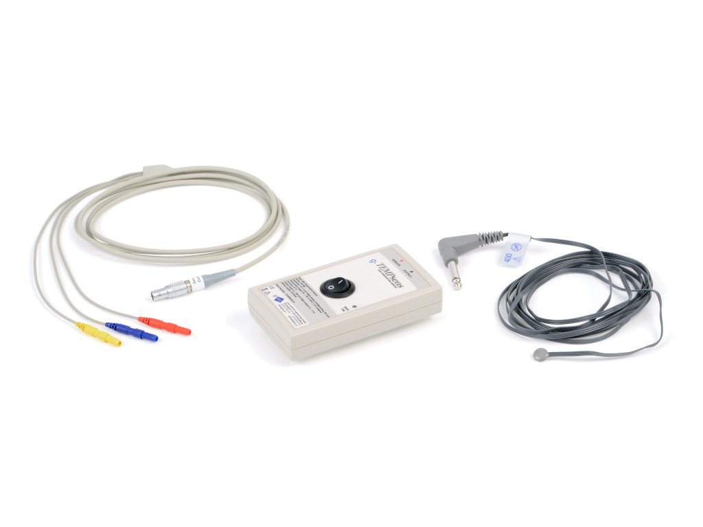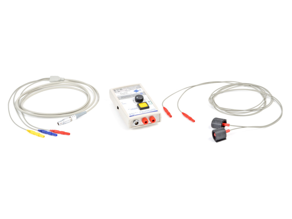 This method is also called EDA (electro-dermal activity) or skin conductance, where two small electrodes are placed on fingers without gel. The isolated circuit guarantees no interference with other electrodes on the body. Technical details: 0 – 30 µS, 1µS (micro MHO) calibration button.